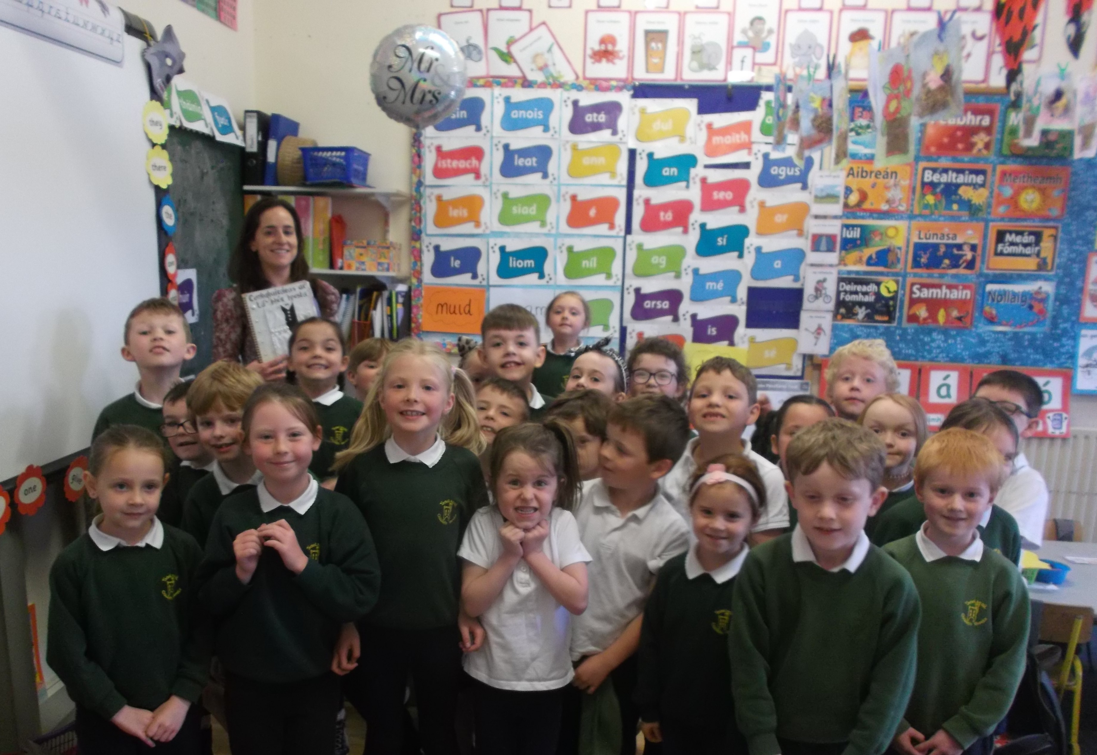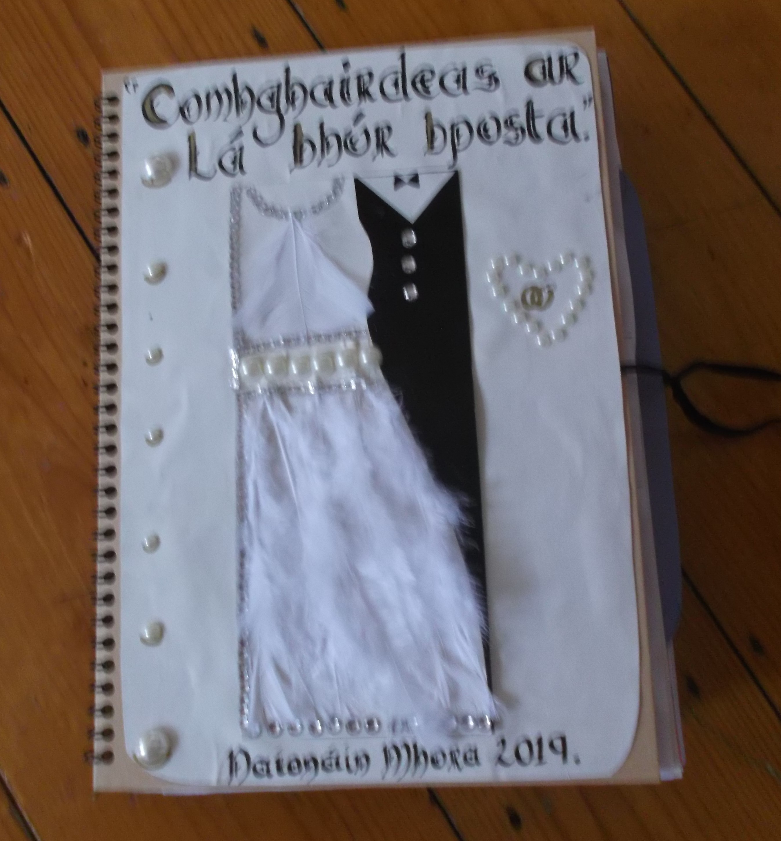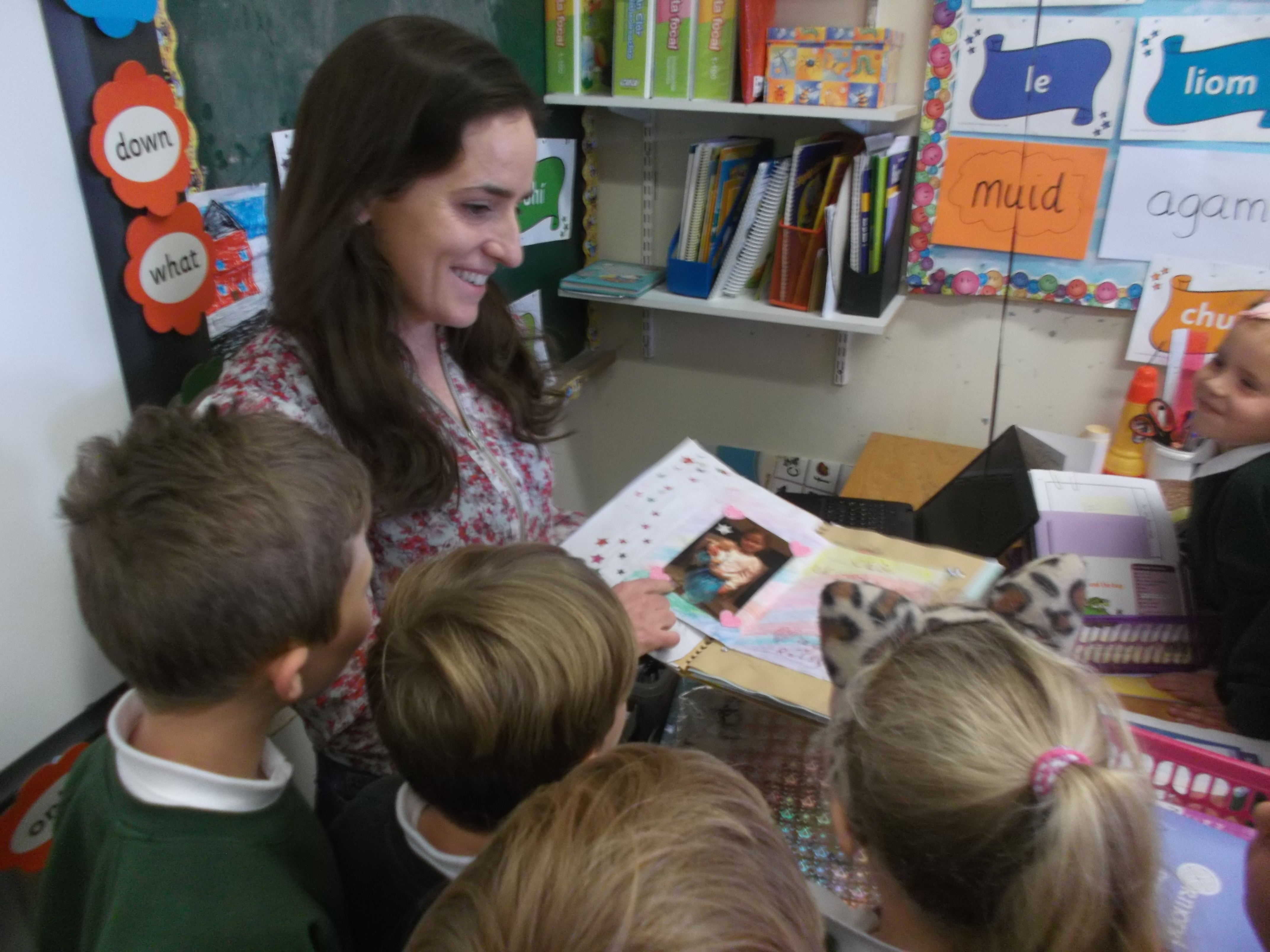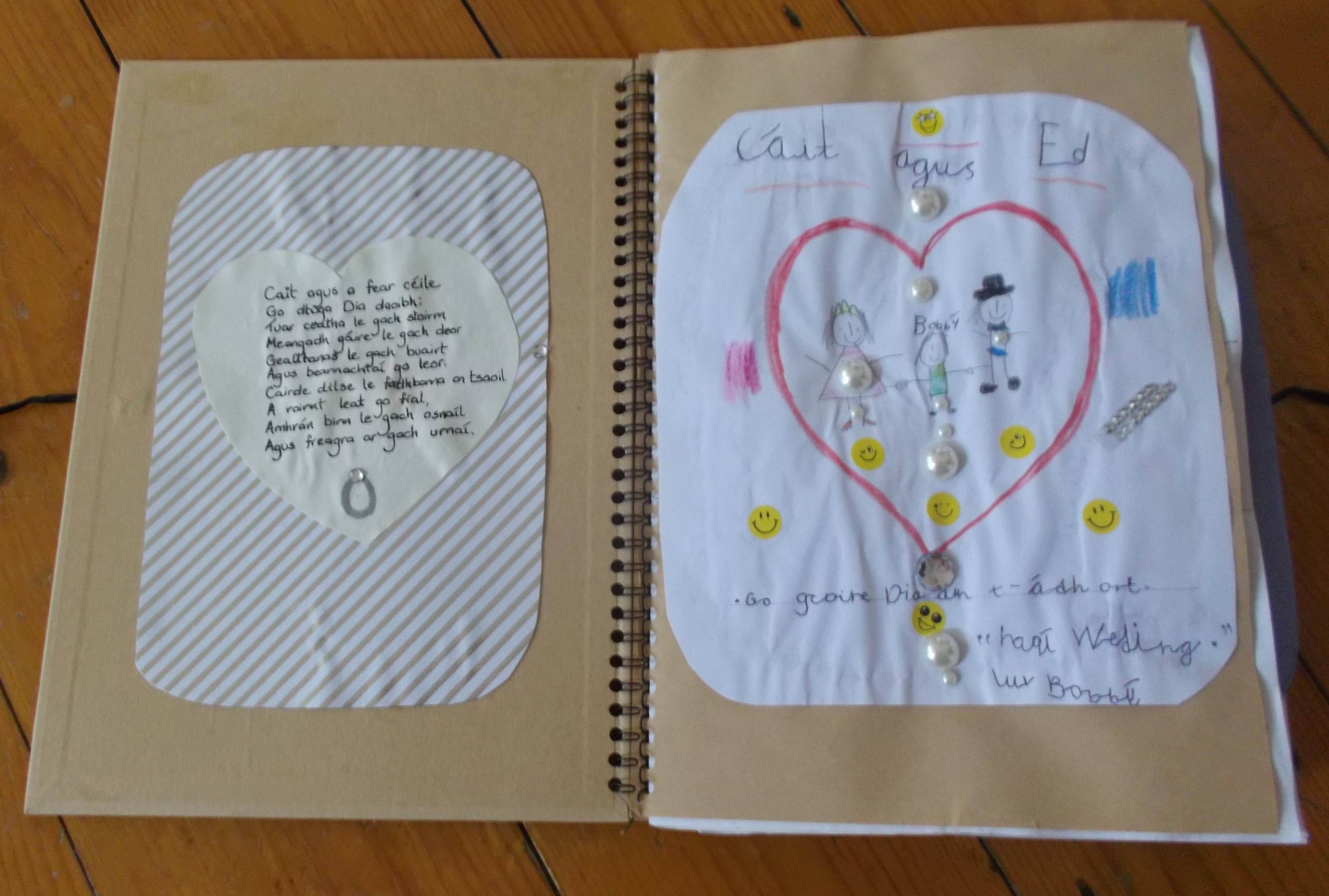 We extend our best wishes to Múinteoir Cáit who is getting married at the weekend. Naíonáin Mhóra presented her with a book they had made themselves as a present.